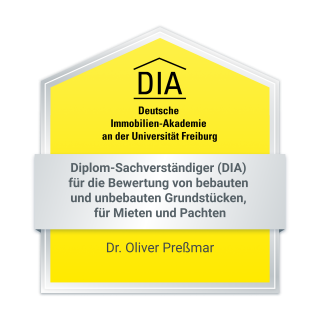 Dr. Oliver Preßmar absolvierte neben seiner technischen und wirtschaflichen Ausbildung und seiner langen Tätigkeit im Bereich der Immobilienwirtschaft eine spezfische Zusatzausbildung an der Deutschen Immobilien-Akademie (DIA) Freiburg – eine der führenden Institution für die Ausbildung von Sachverständigen für Immobilienbewertung in Deutschland. Die Ausbildung orientiert sich am Anforderungsprofil der öffentlichen Bestellung und Vereidigung (Sachkundenachweis) bzw. als Grundlage für die Zertifierung nach DIN EN ISO/IEC 17024.